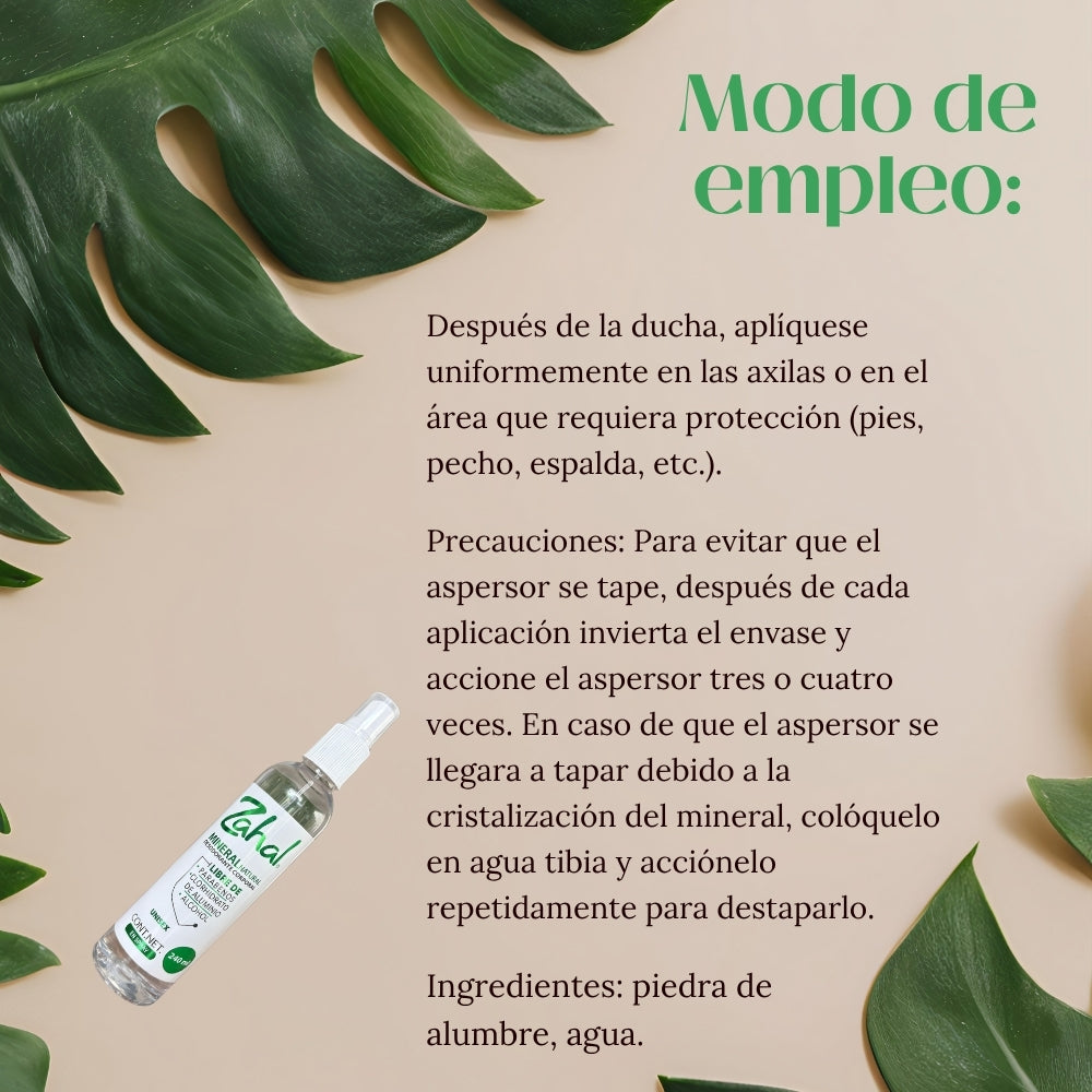 ZAHAL Spray es un desodorante natural líquido, práctico y funcional, elaborado con piedra de alumbre.