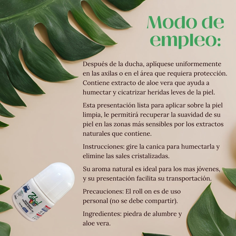 ZAHAL Roll on es un desodorante natural, práctico y funcional, elaborado con piedra de alumbre y extracto de sábila (aloe vera).